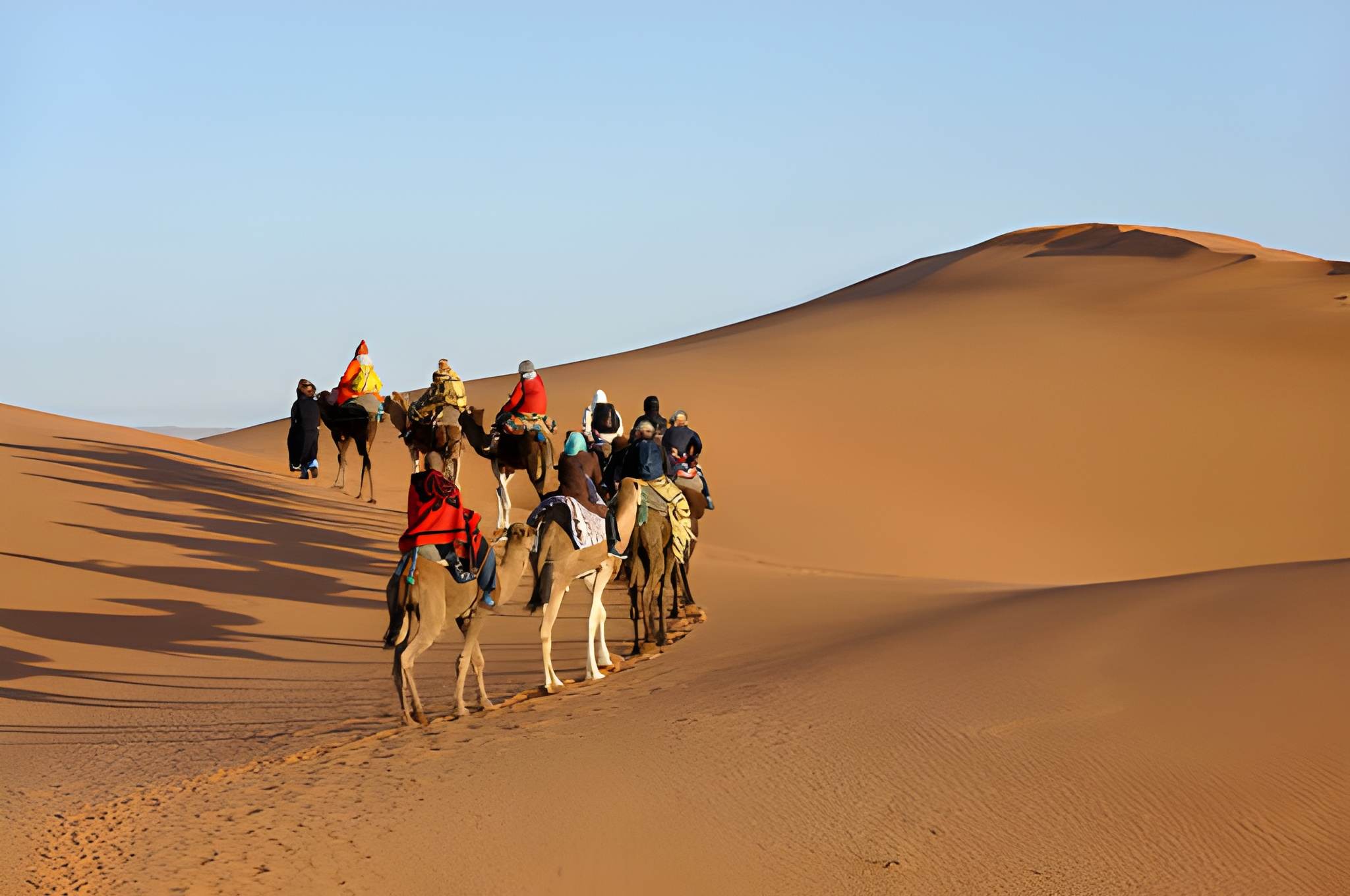 We travel toward the Middle Atlas, stopping in Ifrane and the Azrou forest to see the wild monkeys. After crossing the Tizi Ntalghamt pass. Reach the Erg Chebbi dunes. We will ride dromedaries to sleep in a Berber camp under the stars.