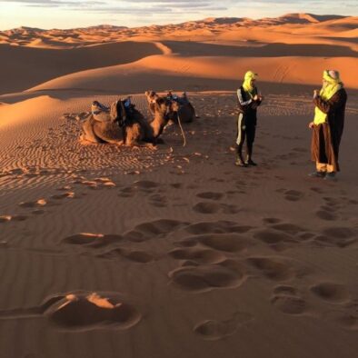 Una vez llegamos al desierto, los guías nos estaban esperando para viajar en dromedario hasta las jaimas, totalmente equipadas y en las que estuvimos divinamente, de nuevo gracias en buena parte a la profesionalidad de todos los trabajadores. Tras tomar un te de bienvenida y conversar brevemente con ellos, tuvimos tiempo para subir a las dunas, hacer sunboard y ver el atardecer. Tanto la cena como el desayuno consistieron en platos típicos de la gastronomía bereber y por la noche celebramos una velada alrededor de un fuego en la que tocaron instrumentos musicales y cantaron canciones tradicionales.