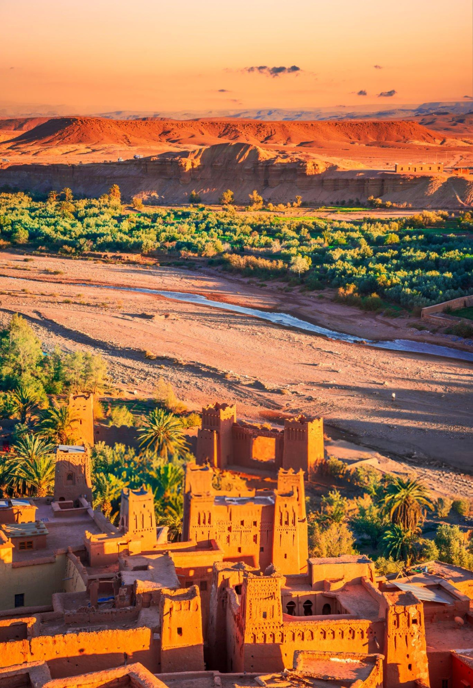 Ruta de 3 días de Marrakech al desierto , comienza poco después de nuestro encuentro. A continuación, nos dirigiremos a la Kasbah de Ait Benhaddou, recorriendo la carretera del Alto Atlas. Haremos una parada en Ait Benhaddou, uno de los lugares más emblemáticos de Marruecos y escenario de películas de Hollywood. Fue lugar de rodaje de numerosas películas, como Gladiator y El Reino de los Cielos. Después, visitaremos Ouarzazate, también presente en estas películas. Posteriormente, nos dirigiremos al Oasis de Skoura, uno de los oasis más exuberantes de Marruecos. Finalmente, nos dirigiremos al Valle del Dades y sus gargantas para explorar las formaciones rocosas conocidas como los «Dedos de Mono» antes de alojarnos en un hotel con vistas panorámicas.
